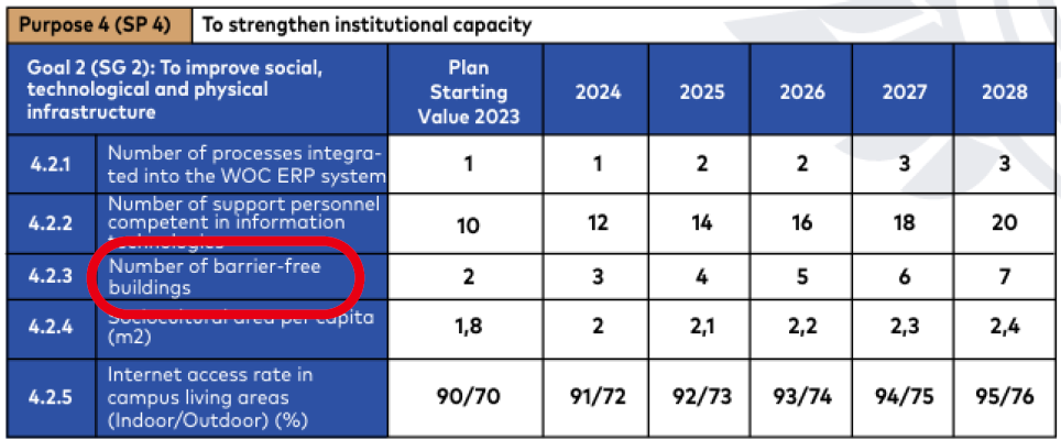 Within the 2024–2028 Strategic Plan, under the objective “Strengthening Institutional Capacity,” the goal “Enhancing Social, Technological, and Physical Infrastructure” includes increasing the number of accessible buildings as a key strategic indicator. The plan outlines that the number of accessible buildings, which was two in 2023, will be gradually increased to seven by 2028.