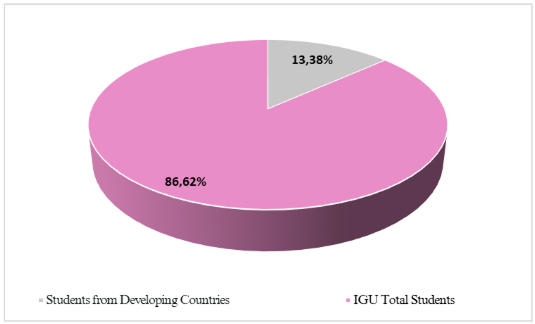 Compared to the previous year, the proportion of international students from developing countries increased from 11,71% in 2023 to 13,38% in 2024. In 2024, the total number of students studying at IGU was 37.918, of which 5.075 were international students from developing countries. The proportion of these students within the total student population is 13,38%, as illustrated in the figure below.