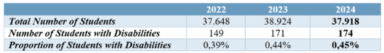 The table below presents the number and proportion of students with disabilities by year. The percentage of students with disabilities increased from 0,39% in 2022 to 0,44% in 2023, and further to 0,45% in 2024.