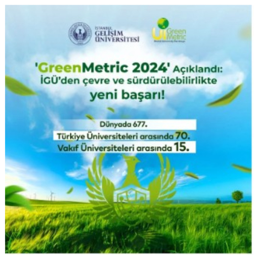 According to the results of the “UI GreenMetric World University Rankings 2024” Istanbul Gelisim University has achieved significant success in its efforts towards environmental sustainability. First included in the rankings in 2022, our university achieved a 435-point increase in 2024, achieving a total score of 6070, ranking 677th globally, 70th in Turkey, and 15th among foundation universities. This result demonstrates the effective implementation of IGU's holistic policies in areas such as environmental responsibility, campus sustainability, waste management, and energy efficiency. With this success, our university directly contributes to SDG 13 and achieves a strong international standing in sustainable campus practices.